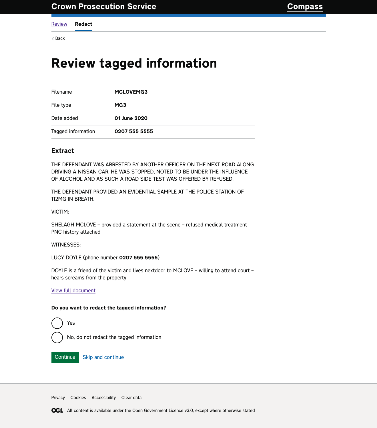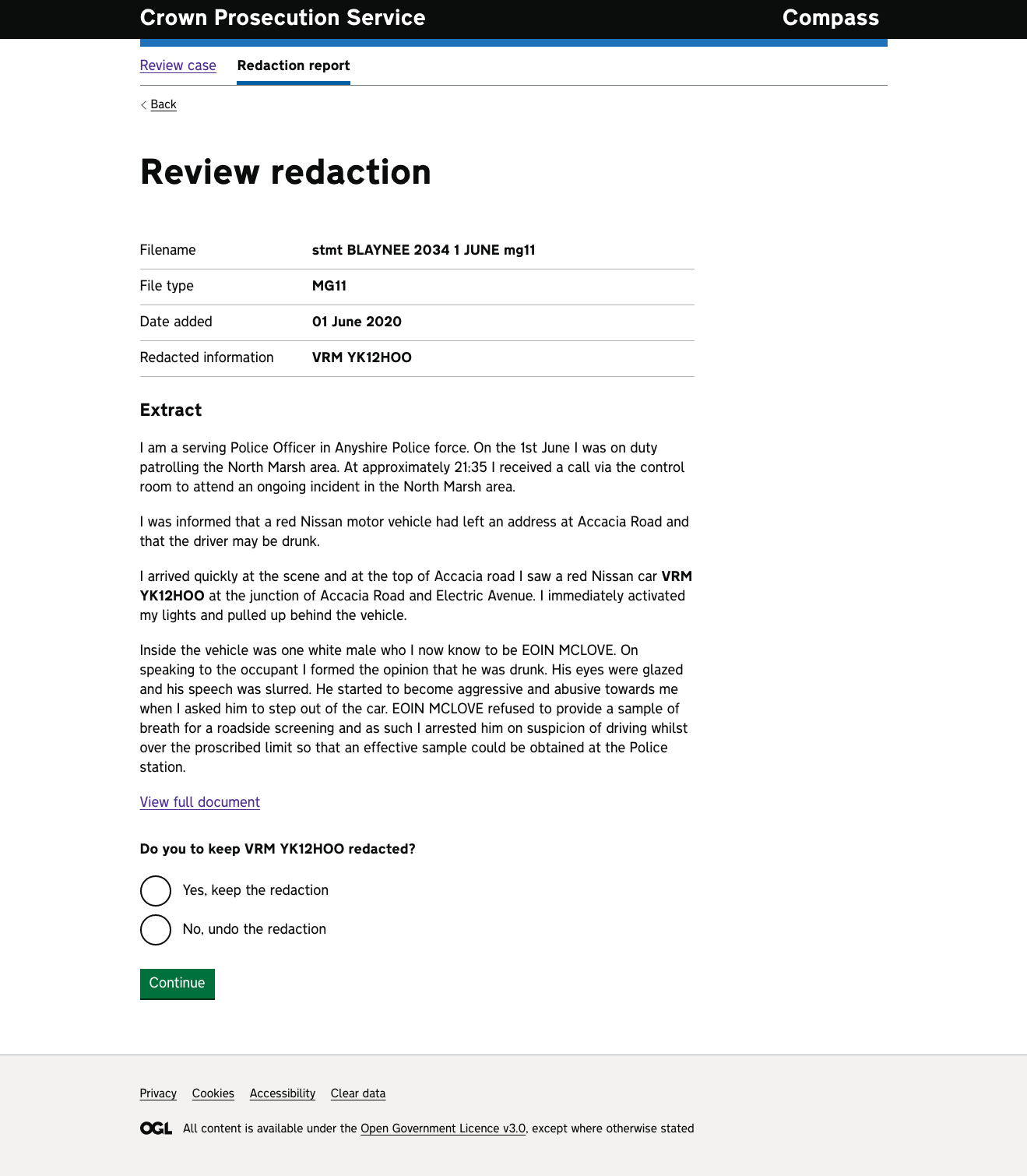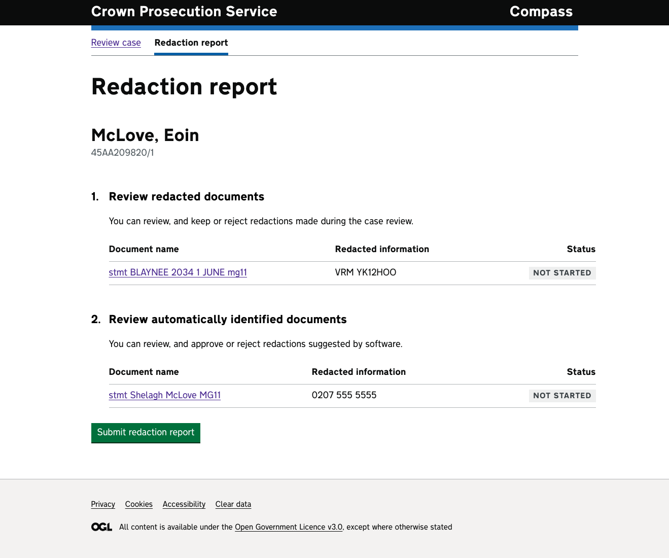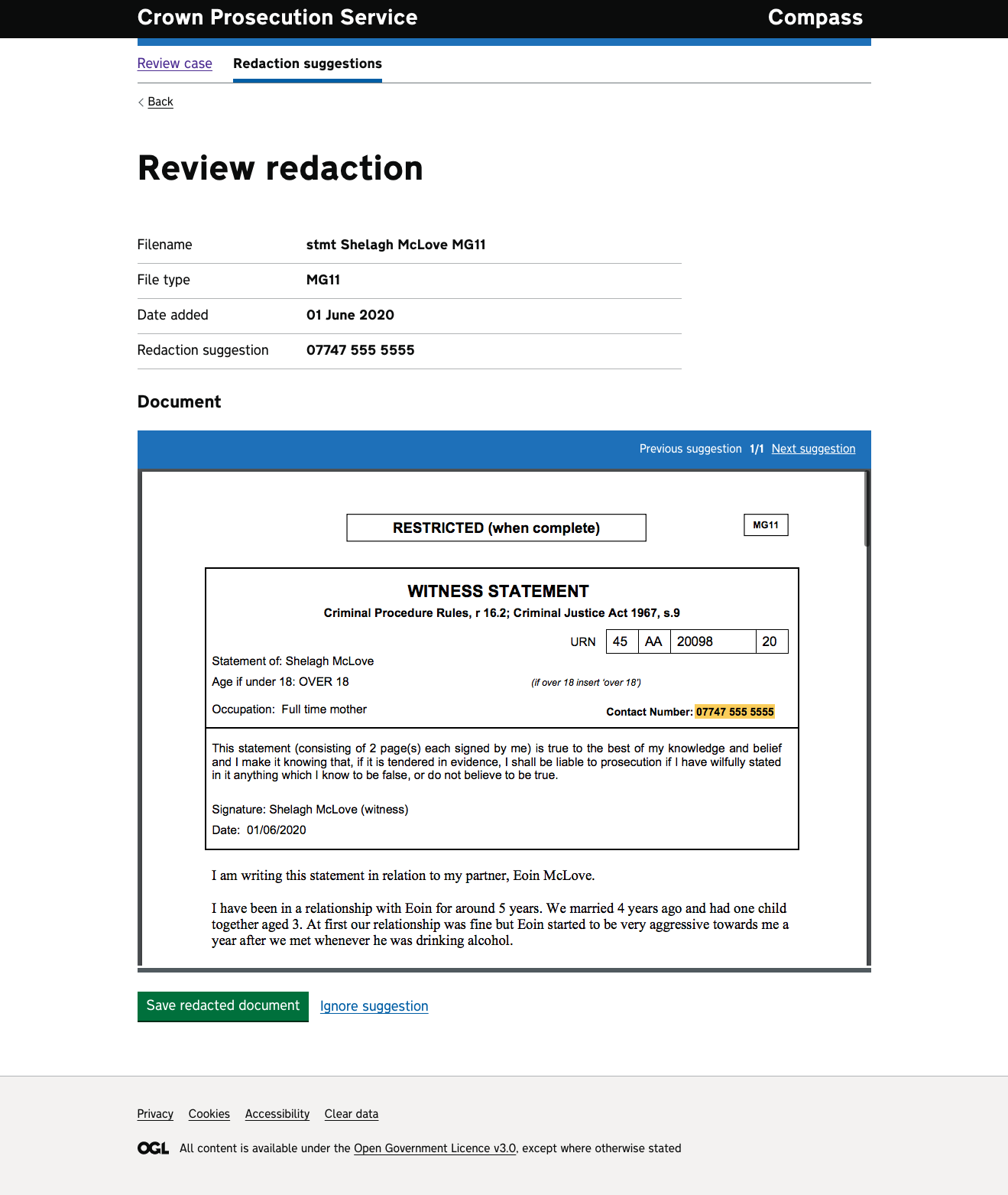 We changed the system to allow users to redact as they go along (see below for this process) but kept the idea of being able to review and check all the redactions that had been made as well as viewing suggested redactions from our ML system.