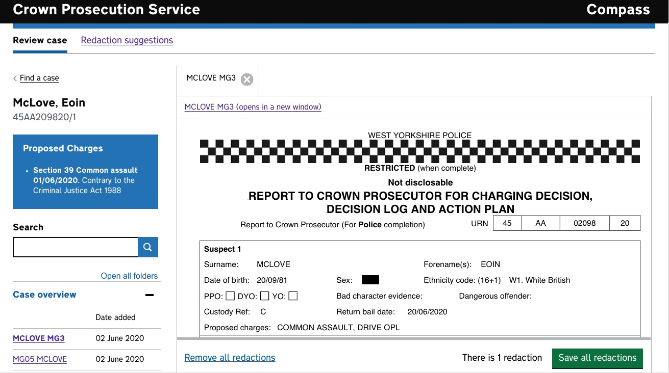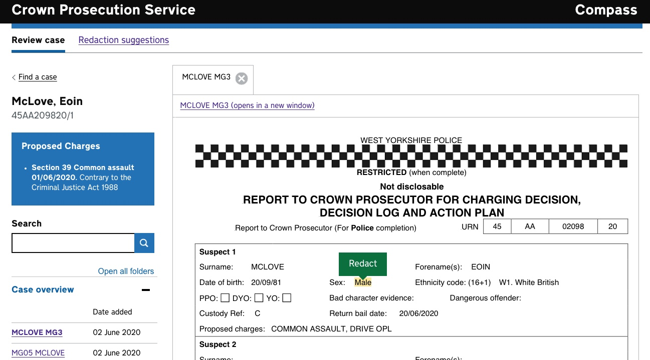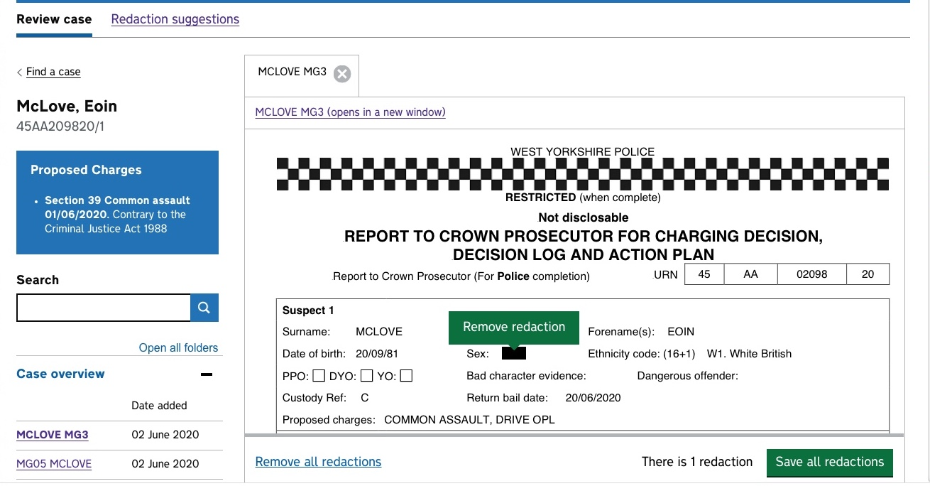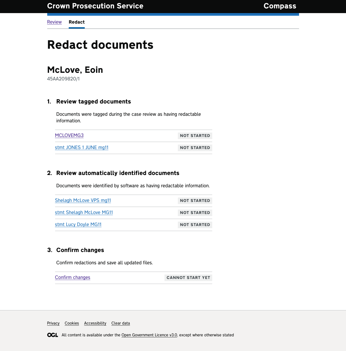 We initially started with redaction being a seperate process from case review - and it sitting in a new tab - because users often treat it as a seperate process. But, we quickly realised that this was only the case because the current system made it very difficult to make redactions as you went along. When we realised this we integrated the main redaction function into the case review page.