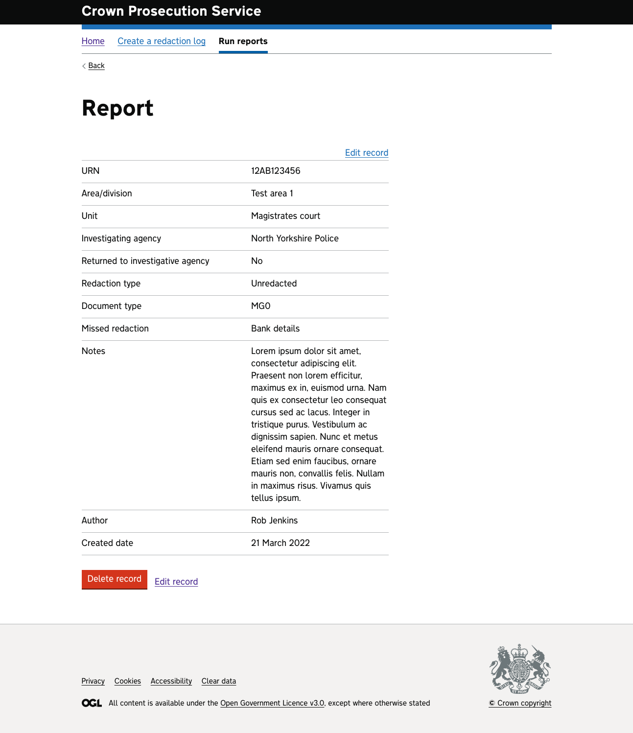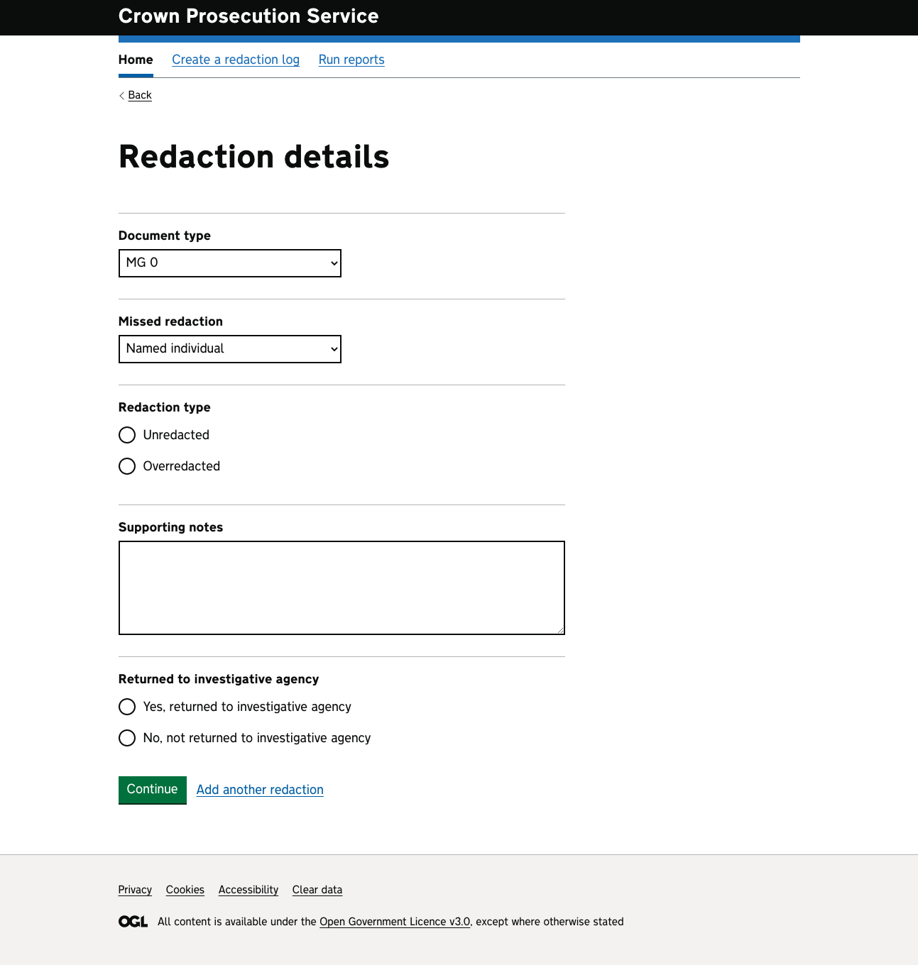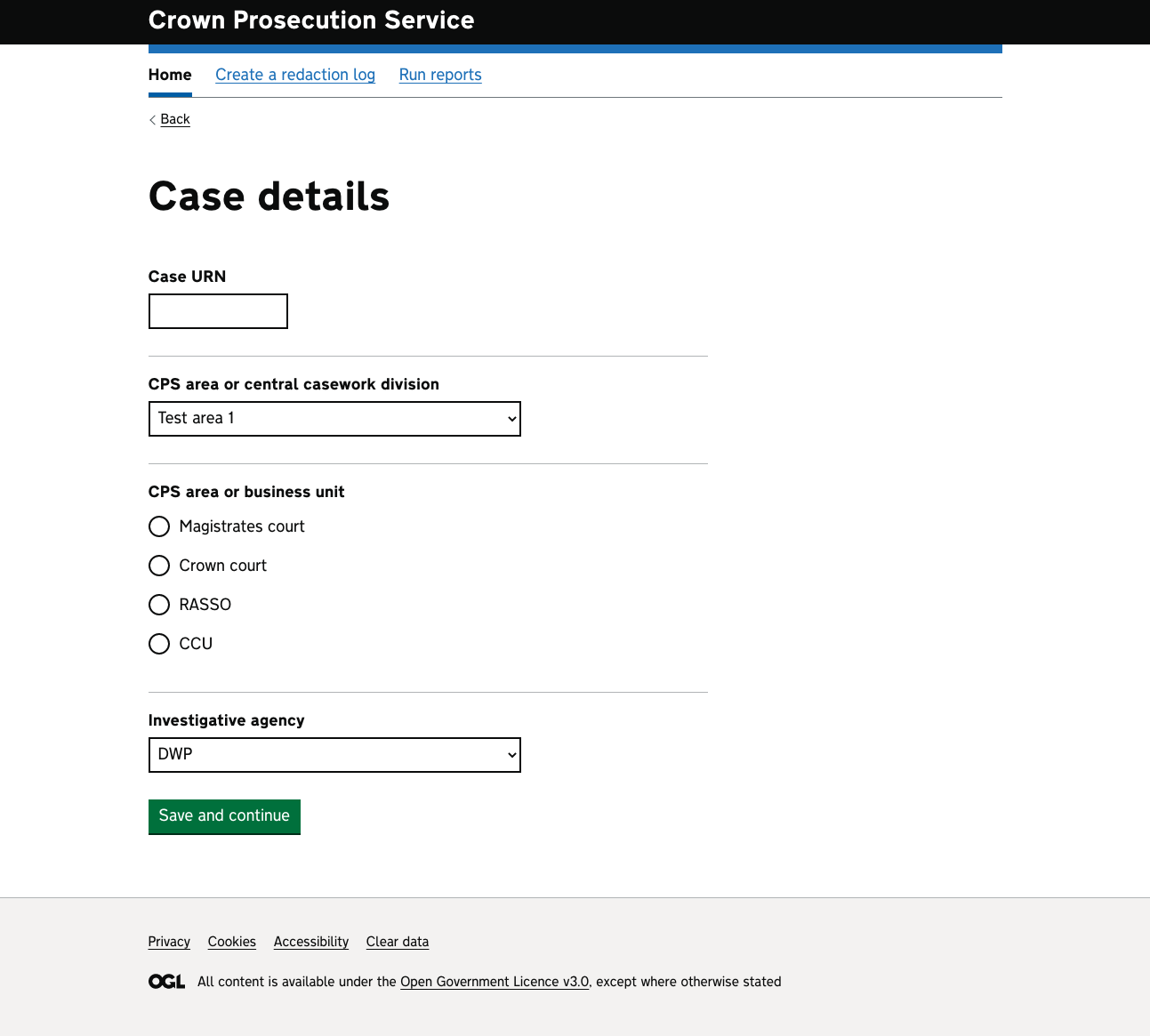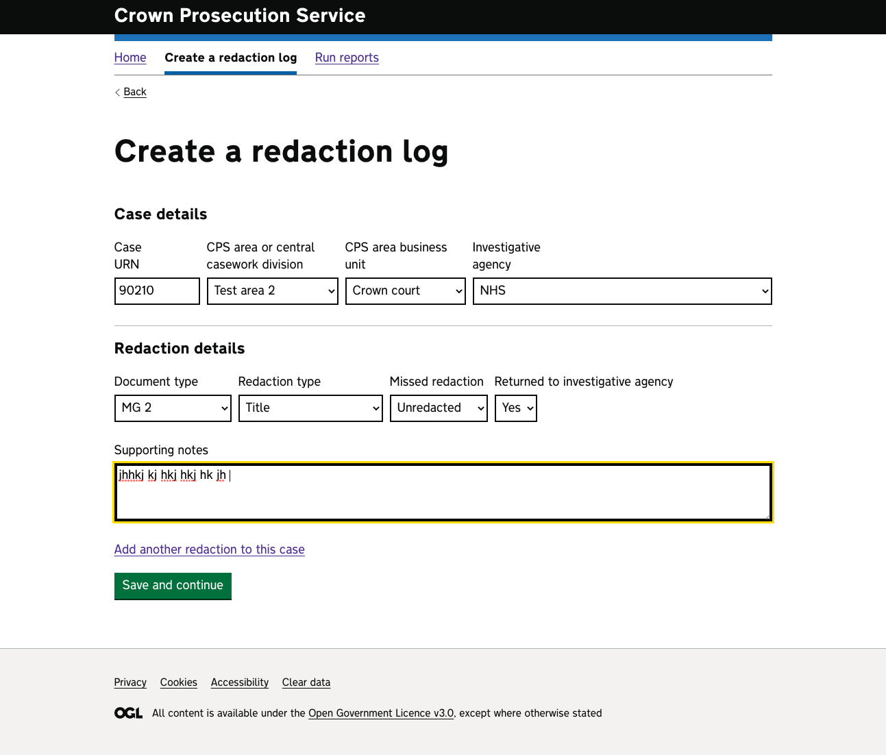 Follows the layout of the existing system where both the case and the redaction are entered on one page - uses a lot more dropdowns and has more info on the page compared with the more traditional version. Usually this wouldn’t be the way to go, however these are ‘expert’ users and they are used to entering info in this way. Would still need proper user testing