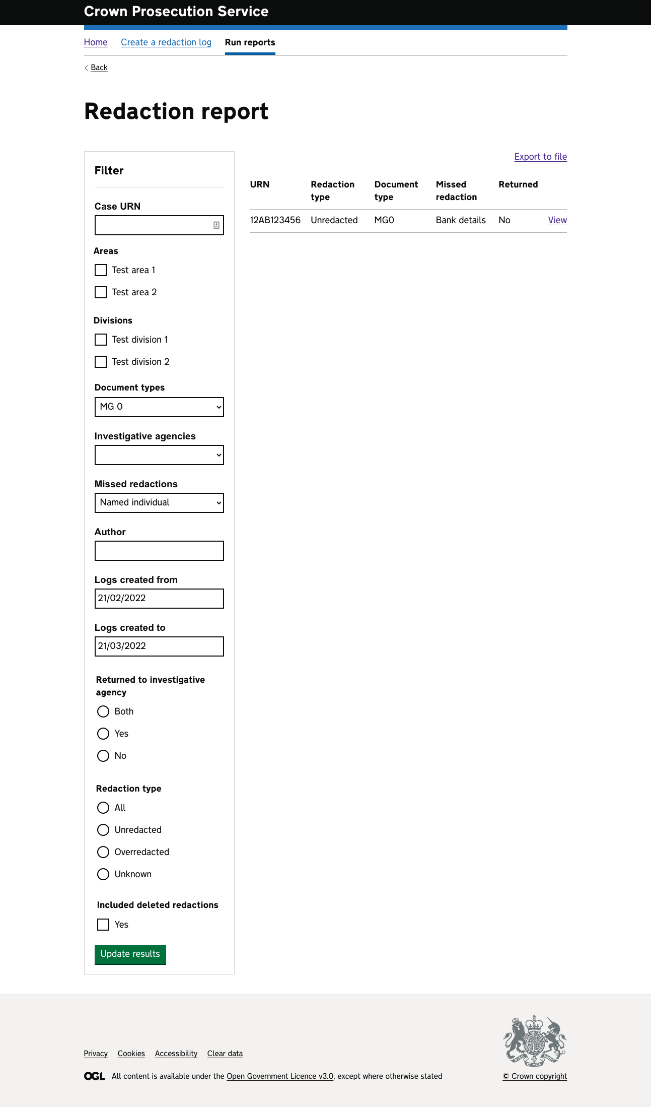 Uses the same filters are the current version but uses the GDS styling. The current version shows all the report fields in the search results, but can’t do this without horizontal scrolling which is not ideal. This version suggests that we find out the most important fields and only show those. Other fields are availble if the user clicks the ‘view’ link to see more