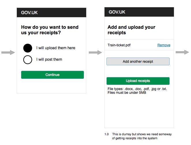 This option lets the user upload all their receipts in one go at the end of the process. The user will have been through the rest of the process and will know what they can claim for and how much. They only need to upload once.