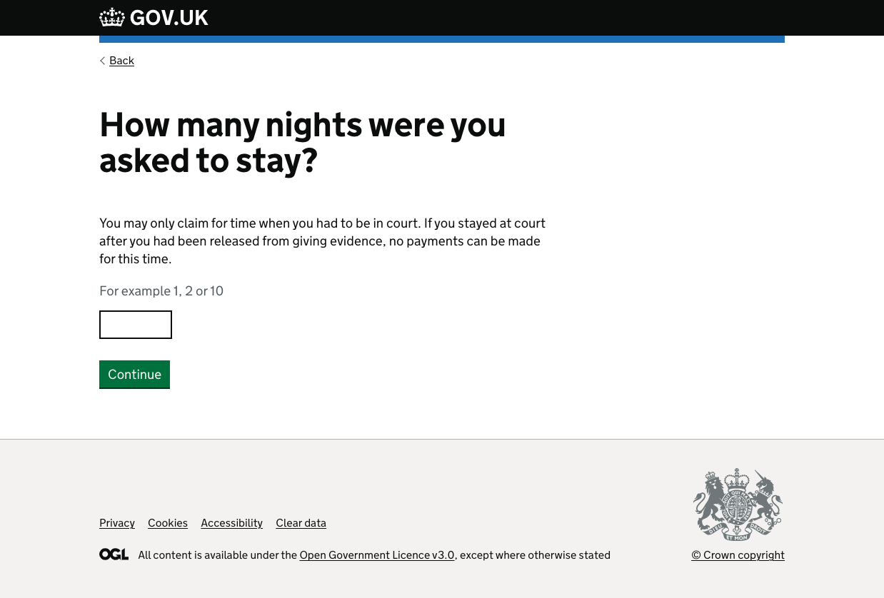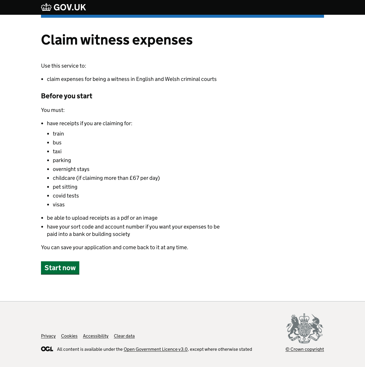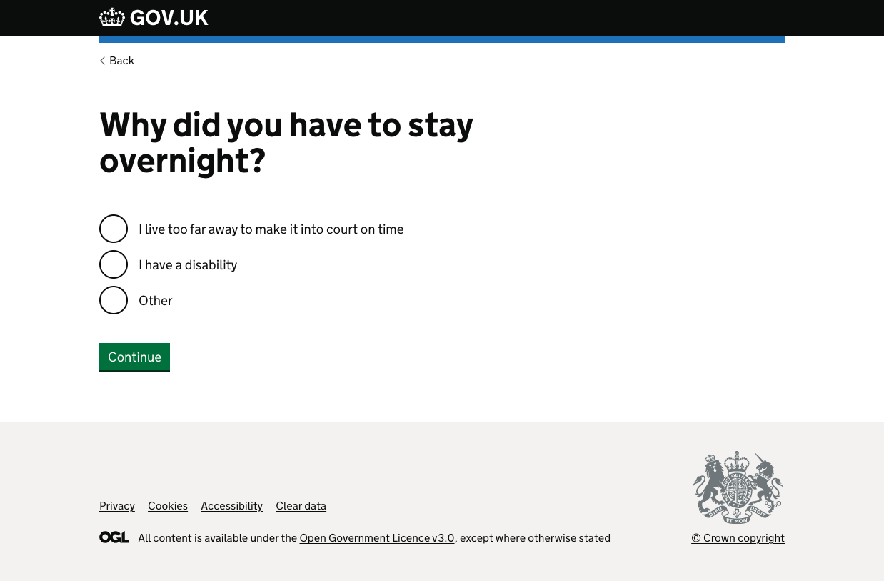 We also considered whether we front-load the login page with a list of requirements for a user - e.g. evidence of receipts, details of the court dates - to ensure a user didn’t have to leave the journey as they didn’t know what they needed to complete it.