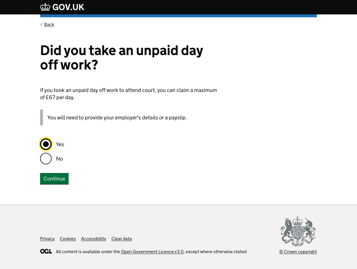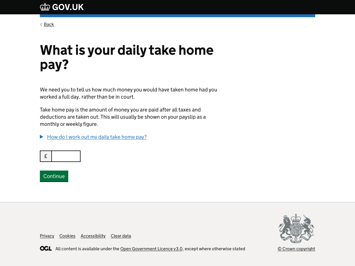 The current form asks employers to fill out the amount that a user would have lost on the day they were off, we didn’t want to use this method in the digital form for several reasons - we’d heard from users that a significant percentage would not want to tell their employer they were going to court, we were not convinced that the calculations would be accurate just because employers were doing it and we didn’t want to add a process that would stop or delay the process because of a reliance on a 3rd party.