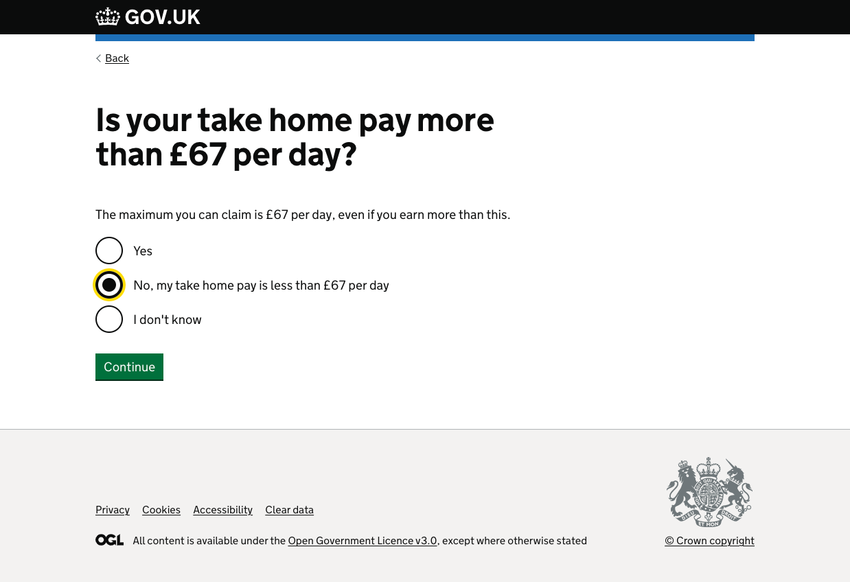 The policy was to pay users a maximum of £67 a day, which is only just above the adult minimum wage per person. If they earned less, then we would need to know how much they earned in order to pay them that amount. Our hypothesis was that users would find this difficult to know or workout.