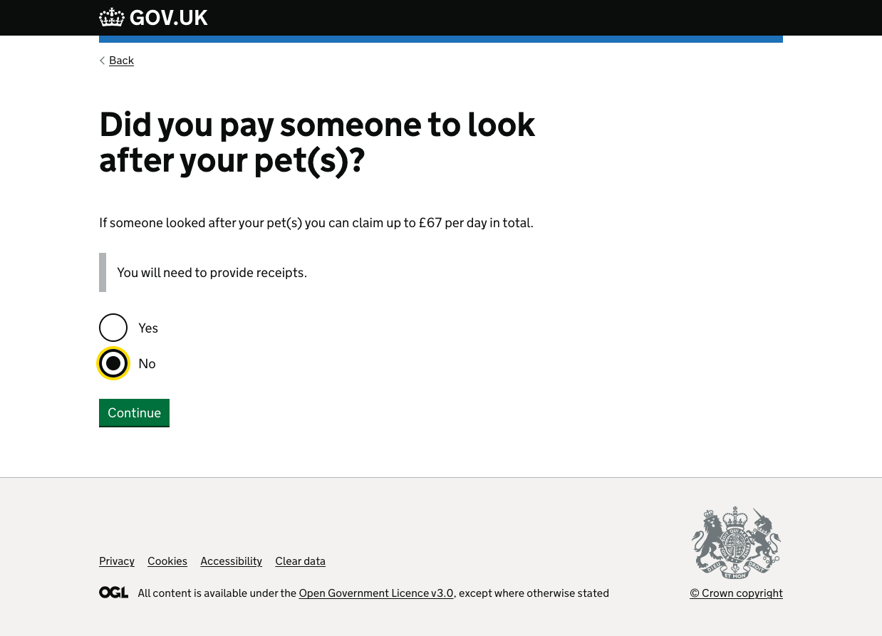 Users can claim for pet sitting if they had to get someone to look after their pets while they were in court. This is not pulled out as a specific category in the current blue form but has the highest volume of claims in the ‘other expenses’ section.