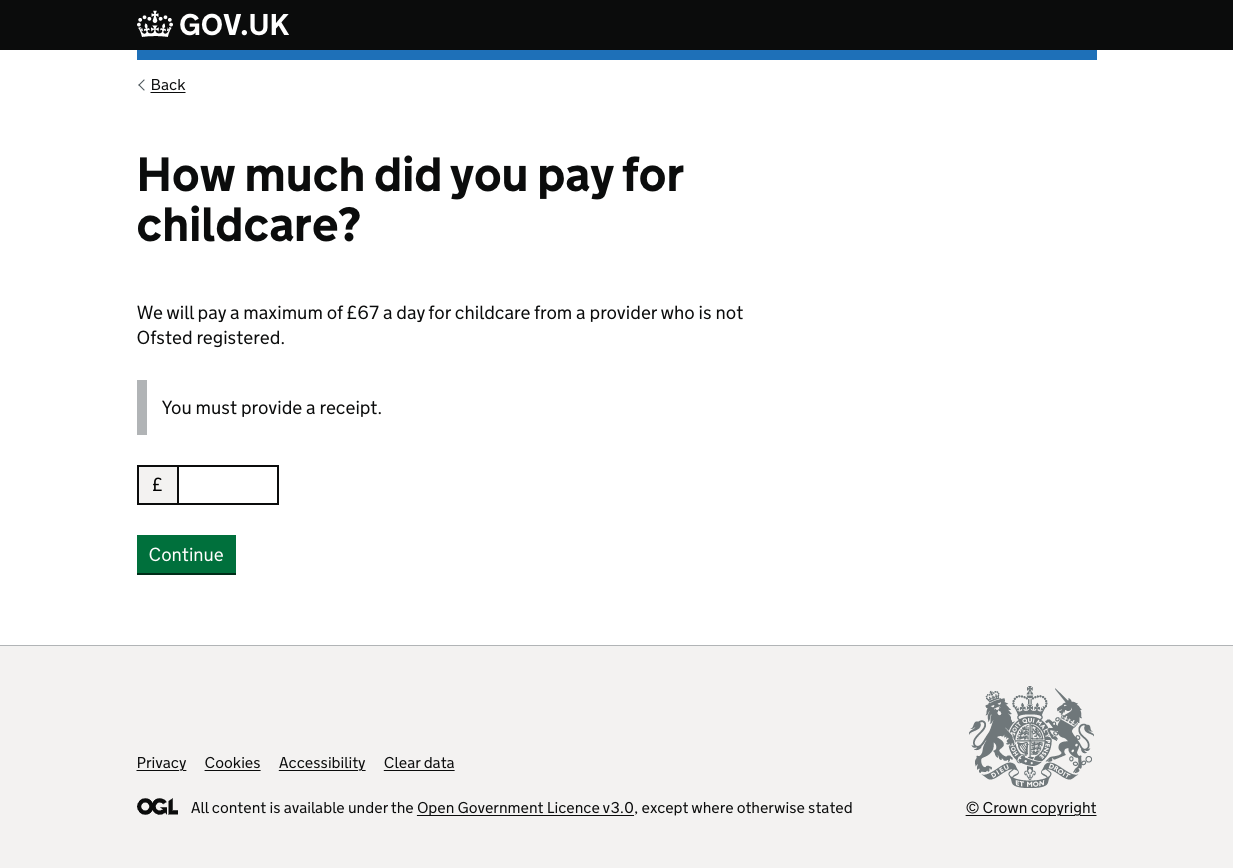 Users can only claim £67 per day because their child was not looked after by a Ofsted registered childminder. They will still need a receipt for this