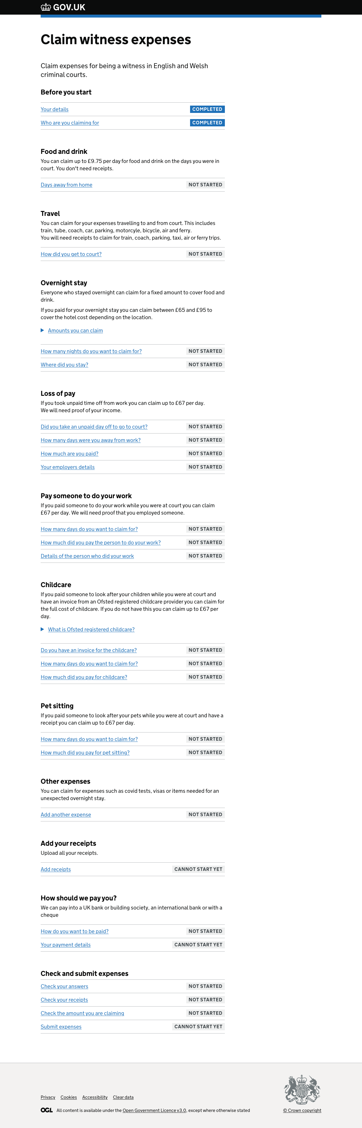 This is still fairly rough but the idea was to split the things that users could claim for - travel, food, overnight stays etc into sections on the task list, they would then choose the relevant ones and fill them in (there is a variant on this where users chose which ones were relevant first and were then shown a tailored task list)